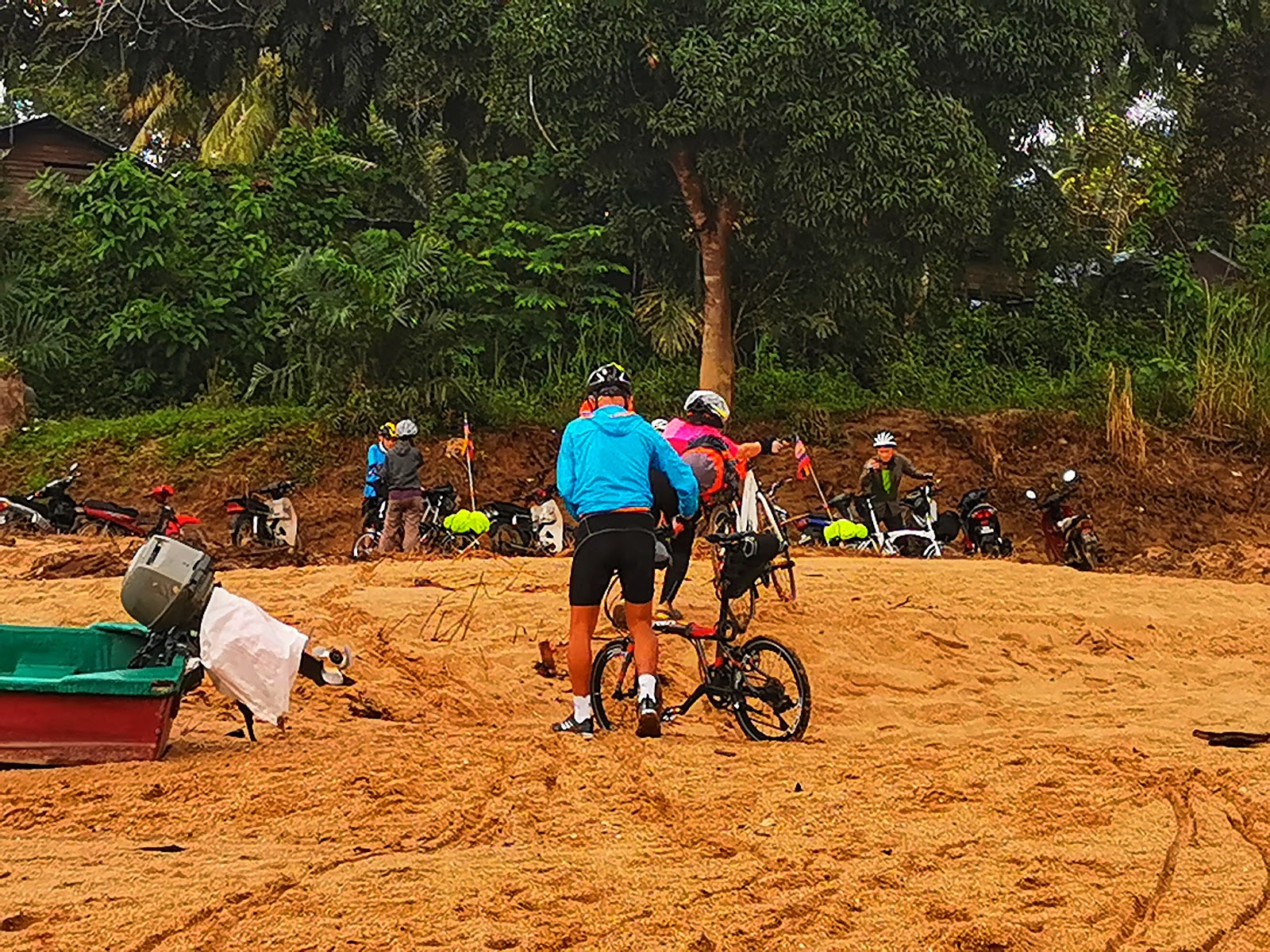As the river was swollen on the day of our crossing, we only had a 50 m challenge from boat to high ground. But it was a spartan challenge to get bike and feet off soggy ground.